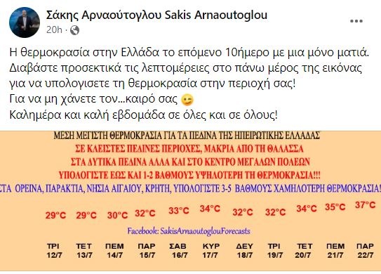 Τις θερμοκρασίες το επόμενο 10ήμερο στην Ελλάδα παρουσίασε ο έμπειρος προγνώστης καιρού της ΕΡΤ, Σάκης Αρναούτογλου, σε ανάρτησή του στο Facebook. Όπως διευκρινίζει, οι θερμοκρασίες αφορούν τη μέση μέγιστη θερμοκρασία για τα πεδινά της ηπειρωτικής Ελλάδας.