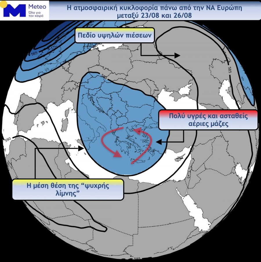 Βασική αιτία για τις πολυήμερες, έντονες και εκτεταμένες βροχοπτώσεις αποτελεί μια ατμοσφαιρική διαταραχή στην ανώτερη τροπόσφαιρα η οποία προερχόμενη από το Β. Ατλαντικό κινήθηκε αρχικά προς την ευρύτερη περιοχή της Αδριατικής και των ΒΔ Βαλκανίων στην πρώτη φάση της κακοκαιρίας επιδεινώνοντας έτσι σταδιακά τον καιρό στην χώρα μας κατά την διάρκεια του Σαββατοκύριακου 20-21/08 στα κεντρικά και βόρεια.