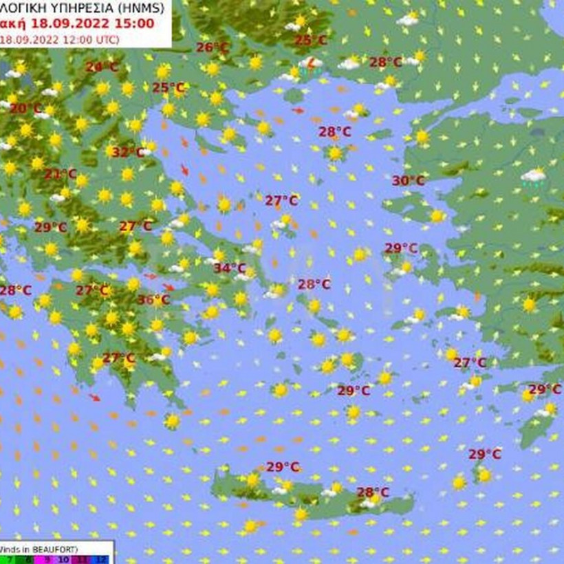 Θερμοκρασία: Από 18 έως 36 και κατά τόπους στη Θεσσαλία και την ανατολική Στερεά έως 37 με 38 βαθμούς Κελσίου.