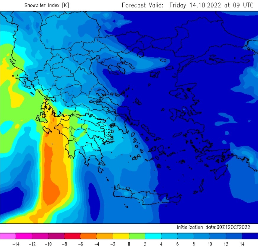 Όπως φαίνεται και στην εικόνα παρακάτω, οι δείκτες αστάθειας στη Δυτική Ελλάδα το πρωινό της Παρασκευής είναι τέτοιοι που θεωρείται πλέον πολύ πιθανό να έχουμε στις προαναφερθείσες περιοχές ακόμα και κατά τόπους έντονα η πλημμυρικά φαινόμενα. Εκτιμώ ότι είναι αυξημένη η πιθανότητα ακόμη και για τοπικά ισχυρές χαλαζοπτώσεις διότι έτσι και αλλιώς θα υπάρξουν εκτεταμένα καταιγιδοφόρα νέφη που θα δίνουν εκείνη την ώρα έντονη ηλεκτρική δραστηριότητα. Ίσως να υπάρξει και μέσα στο Ιόνιο η αρκετές φορές εμφανιζόμενη σε κακοκαιρίες «γραμμή λαίλαπας» που σημαίνει ότι εκτεταμένες καταιγίδες σε σχεδόν ευθεία γραμμή και σε μήκος αρκετών χιλιομέτρων θα κινηθούν από την Αδριατική προς τα Επτάνησα.