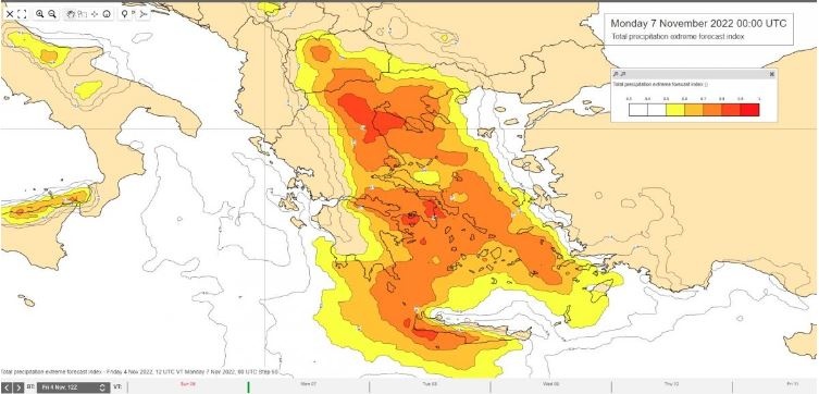 Στον χάρτη του EFI για την βροχόπτωση την Κυριακή έως τις 00:00 διακρίνονται οι περιοχές των ακραίων τιμών υετού με βάση τις κλιματικές παραμέτρους κάθε περιοχής.
