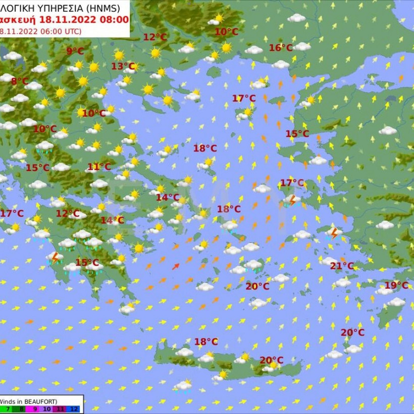 Οι άνεμοι στα δυτικά θα πνέουν από δυτικές διευθύνσεις 5 με 6 και στο Ιόνιο πρόσκαιρα έως 7 μποφόρ με σταδιακή εξασθένηση. Στα ανατολικά θα πνέουν από νότιες διευθύνσεις 5 με 7 και στο Αιγαίο τοπικά 8 μποφόρ, ενώ σταδιακά θα στραφούν σε δυτικών διευθύνσεων 5 με 6 μποφόρ.