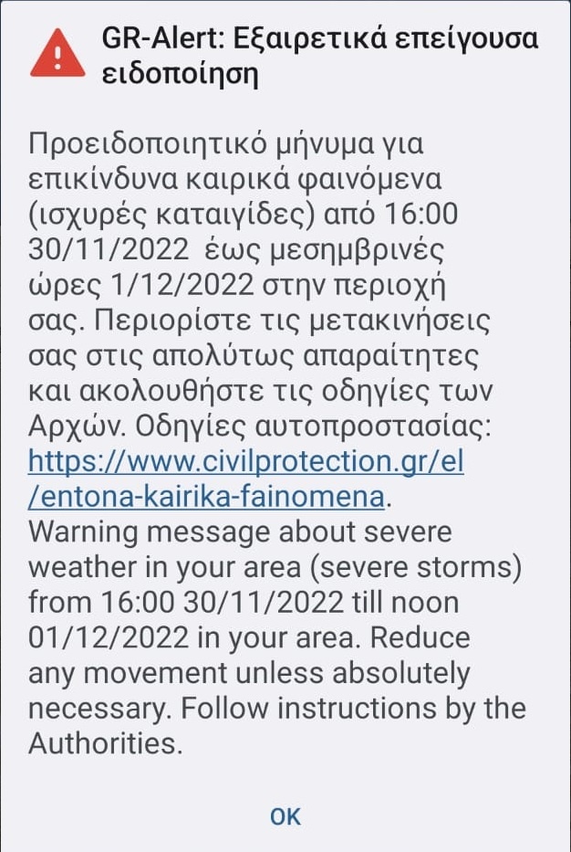 «Περιορίστε τις μετακινήσεις σας στις απολύτως απαραίτητες και ακολουθήστε τις οδηγίες των Αρχών», αναφέρει το μήνυμα.
