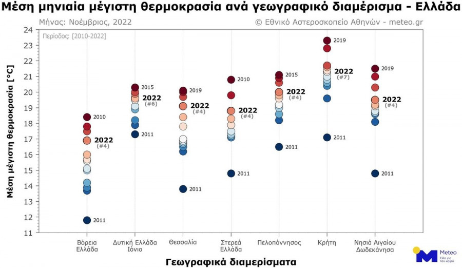 Ο φετινός Νοέμβριος ήταν ο τέταρτος πιο θερμός από το 2010 για τις περισσότερες περιοχές της χώρας μας, ενώ ήταν ελαφρώς ψυχρότερος από τους αντίστοιχους μήνες του 2010, 2015 και 2019. Αυτό δείχνουν τα στοιχεία από τους μετεωρολογικούς σταθμούς του Εθνικού Αστεροσκοπείου Αθηνών/meteo.gr, οι οποίοι κατέγραψαν υψηλές, για την εποχή, τιμές θερμοκρασίας στο μεγαλύτερο μέρος του Νοεμβρίου 2022.