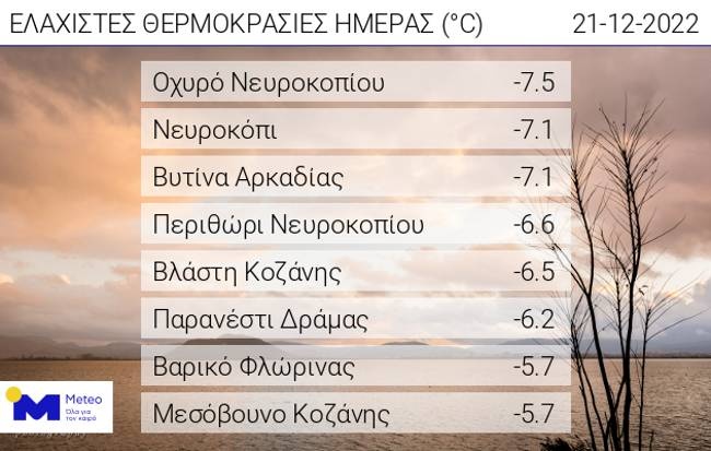 Οι επόμενες χαμηλότερες ελάχιστες θερμοκρασίες καταγράφηκαν σε Νευροκόπι (-7,1), Βυτίνα Αρκαδίας (-7,1), Περιθώρι Νευροκοπίου (-6,6), Βλάστη Κοζάνης (-6,5), Παρανέστι Δράμας (-6,2) και Βαρικό Φλώρινας (-5,7).