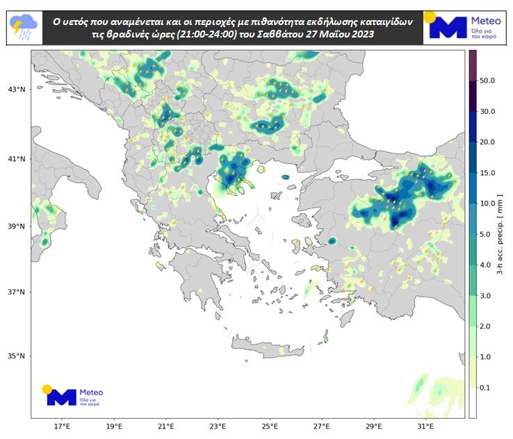 Εξασθένησή τους αναμένεται από τις πρώτες βραδινές ώρες με εξαίρεση τα βόρεια ηπειρωτικά και κυρίως την Κεντρική και Δυτική Μακεδονία. Στους χάρτες που ακολουθούν παρουσιάζεται ενδεικτικά ο υετός που αναμένεται κατά τις πρώτες απογευματινές (15:00 – 18:00) και κατά τις βραδινές ώρες (21:00 – 24:00) του Σαββάτου 27/05 ενώ με τα σύμβολα των κεραυνών σημειώνονται και οι περιοχές όπου υπάρχει πιθανότητα εκδήλωσης καταιγίδων.