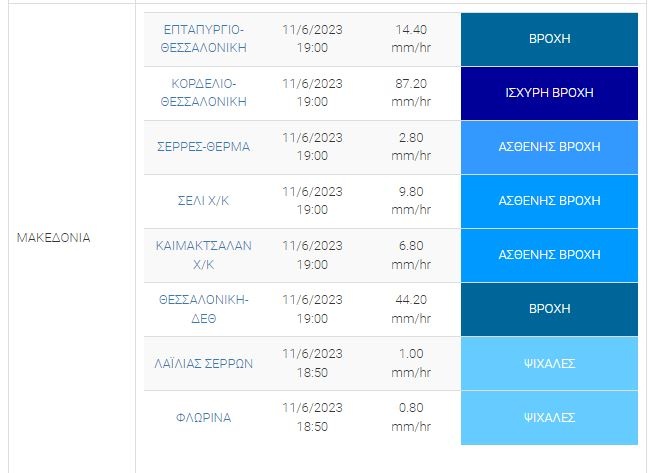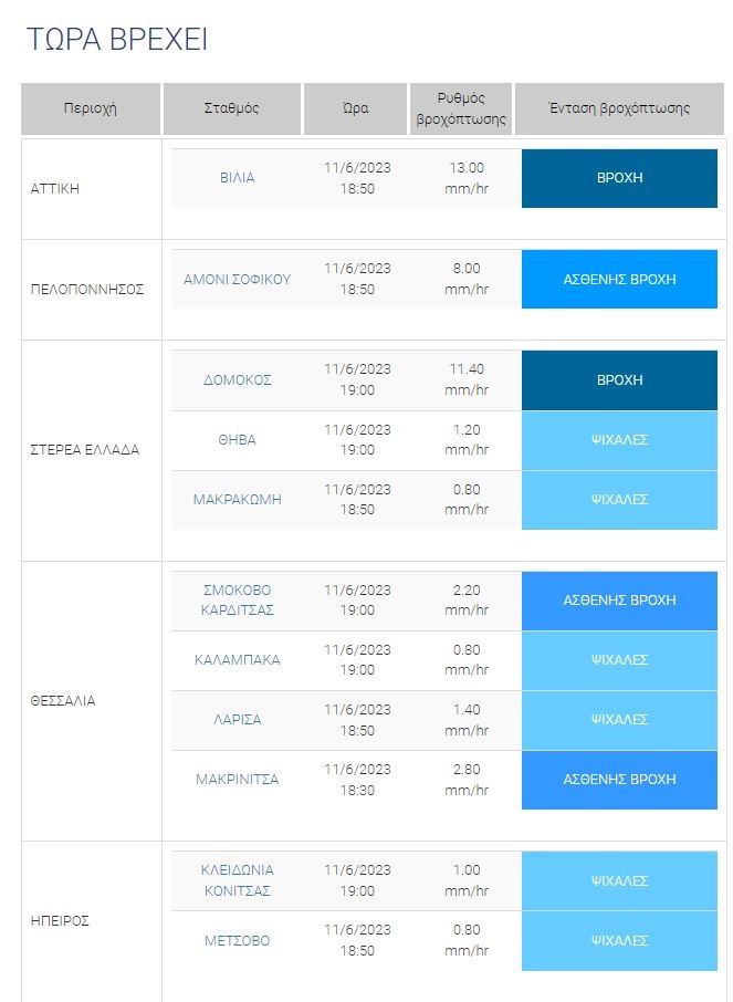 Οι πίνακες του meteo.gr με τις περιοχές στις οποίες παρατηρείται βροχόπτωση αυτή την ώρα: