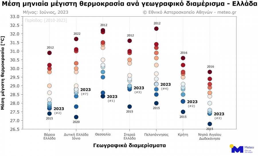 Το επόμενο γράφημα παρουσιάζει την κατάταξη του μήνα Ιουνίου ανά έτος, ανάλογα με τη μέση μηνιαία τιμή της μέγιστης θερμοκρασίας. Για τη Θεσσαλία ήταν ο πιο ψυχρός Ιούνιος από το 2010. Για τη Βόρεια Ελλάδα και τα νησιά του Αιγαίου, συμπεριλαμβανομένης της Κρήτης, ήταν ο 2ος πιο ψυχρός μήνας από το 2010, και για τη Στερεά Ελλάδα ήταν ο 3ος πιο ψυχρός μήνας τα τελευταία 14 χρόνια.