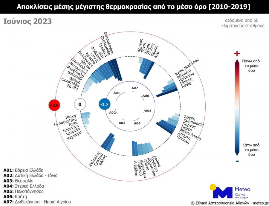 Σύμφωνα με το δίκτυο 50 μετεωρολογικών σταθμών του Εθνικού Αστεροσκοπείου Αθηνών/meteo.gr που λειτουργούν ανελλιπώς από το 2010 μέχρι σήμερα, τον φετινό Ιούνιο η μέση τιμή των μεγίστων ημερήσιων θερμοκρασιών κυμάνθηκαν χαμηλότερα από τον μέσο όρο της περιόδου 2010-2019.