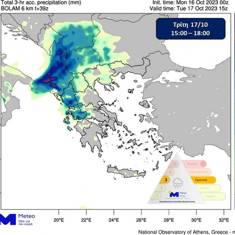 Σύμφωνα με την κατηγοριοποίηση του επεισοδίου βροχόπτωσης (RPI), η οποία εφαρμόζεται από τη μονάδα Meteo του Εθνικού Αστεροσκοπείου Αθηνών, το επεισόδιο βροχόπτωσης για την Τρίτη 17/10, κατατάσσεται στην Κατηγορία 3 (Σημαντική).