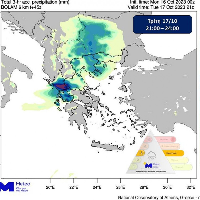 Για την Τρίτη 17 Οκτωβρίου 2023 προβλέπεται ηλιοφάνεια με λίγες νεφώσεις αυξημένες στα δυτικά και βόρεια όπου θα σημειωθούν βροχές και τοπικές καταιγίδες στη Μακεδονία, στην Ήπειρο, στη Δυτική Στερεά και στο Ιόνιο, οι οποίες βαθμιαία θα επεκταθούν στα υπόλοιπα βόρεια και δυτικά τμήματα και αργότερα στα κεντρικά. Τοπικές βροχές αναμένονται και στην Κρήτη. Τα φαινόμενα στην Ήπειρο, στη Δυτική Στερεά και στο Ιόνιο θα είναι κατά τόπους έντονα, ενώ στα νησιά του Κεντρικού Ιονίου και στα δυτικά παράκτια τμήματα υπάρχει πιθανότητα τοπικών χαλαζοπτώσεων.