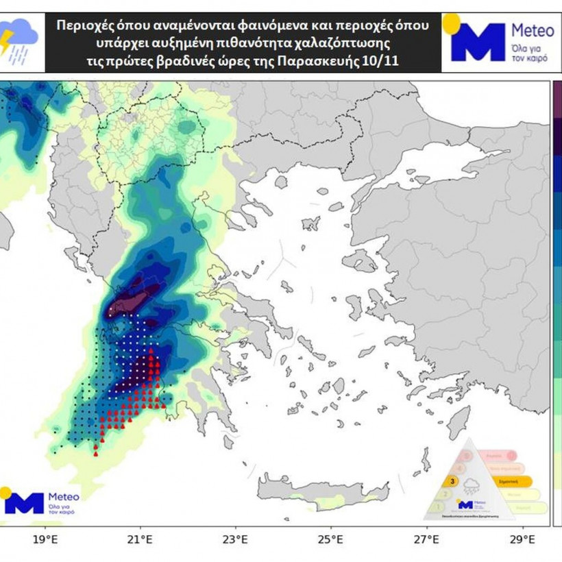 Στους χάρτες που ακολουθούν παρουσιάζεται ο υετός που αναμένεται το απόγευμα και τις πρώτες βραδινές ώρες της Παρασκευής 10/11 καθώς και οι περιοχές με αυξημένη πιθανότητα χαλαζόπτωσης. Με μαύρες και λευκές κουκίδες σημειώνονται οι περιοχές με αυξημένη πιθανότητα χαλαζόπτωσης με χαλάζι μικρού μεγέθους ενώ με κόκκινα τρίγωνα σημειώνονται οι περιοχές με αυξημένη πιθανότητα χαλαζόπτωσης με χαλάζι μεγαλύτερου μεγέθους.