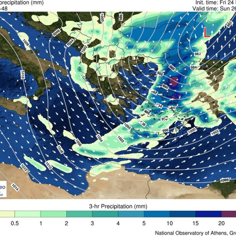Σύντομη αλλά σημαντική επιδείνωση αναμένεται να παρουσιάσει ο καιρός τις επόμενες ώρες σύμφωνα με την υπηρεσία meteo του Εθνικού Αστεροσκοπείου Αθηνών. Σύμφωνα με τα νεότερα προγνωστικά στοιχεία το νέο βαρομετρικό χαμηλό θα επηρεάσει τη χώρα από τις βραδινές ώρες της Παρασκευής 24/11 έως τις πρωινές ώρες της Κυριακής 26/11.