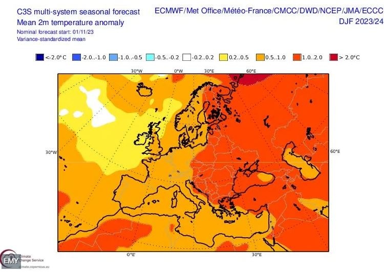 Όπως αναφέρει η ΕΜΥ, η παρουσίαση για τον χειμώνα 2023-2024 (Δεκέμβριος – Ιανουάριος – Φεβρουάριος) προκύπτει τόσο από το μακροπρόθεσμο μοντέλο του ECMWF, όσο και από το σύστημα πολλαπλών μοντέλων (multi-modelsystem). Η κλιματολογία, τόσο του ECMWF όσο και όλων των μοντέλων που συνθέτουν το multi-modelsystem, αναφέρεται στην περίοδο 1993-2016, δηλαδή οι τιμές που παρουσιάζονται αφορούν αποκλίσεις από τις μέσες τιμές της περιόδου αυτής.Ο χειμώνας 2023-24 στην Ευρώπη.