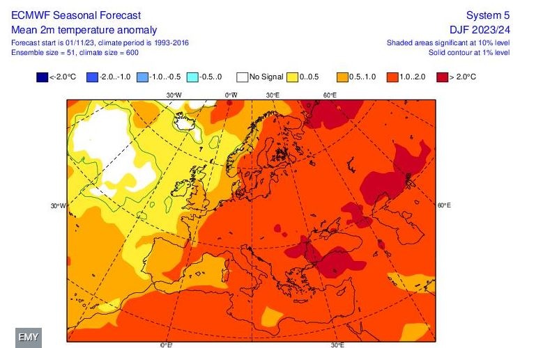 Το ECMWF, για τον χειμώνα στην Ευρώπη προβλέπει συνθήκες θερμότερες από τις κανονικές, αφού παντού εκτιμώνται θετικές αποκλίσεις της θερμοκρασίας.