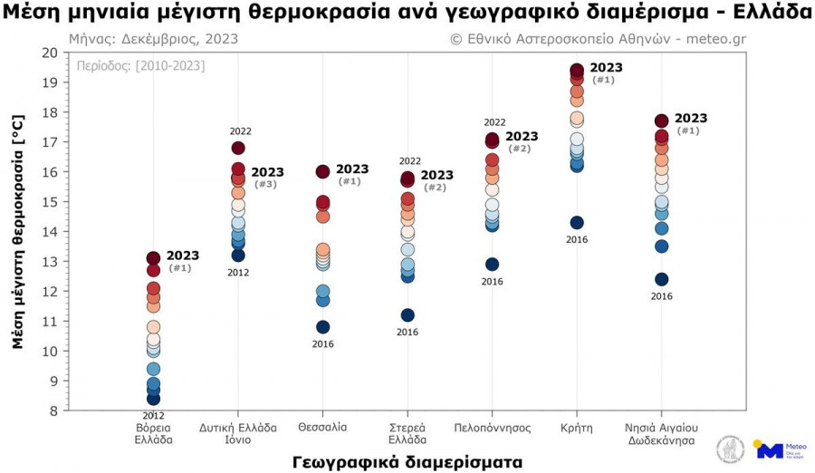 Σύμφωνα με το δίκτυο 52 μετεωρολογικών σταθμών του meteo.gr του Εθνικού Αστεροσκοπείου Αθηνών (ΕΑΑ) που λειτουργούν ανελλιπώς από το 2010 μέχρι σήμερα, τον φετινό Δεκέμβριο η μέση τιμή των μεγίστων ημερήσιων θερμοκρασιών κυμάνθηκε σε ακραία υψηλά επίπεδα σχεδόν στο σύνολο της χώρας, σε σχέση με τον μέσο όρο της περιόδου 2010-2019.