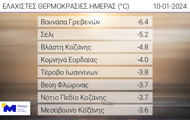 Σύμφωνα με τις καταγραφές του δικτύου μετεωρολογικών σταθμών του meteo.gr του Εθνικού Αστεροσκοπείου Αθηνών, παγετός σημειώθηκε σε πολλές περιοχές της ηπειρωτικής χώρας νωρίς το πρωί της Τετάρτης 10/1. Η χαμηλότερη θερμοκρασία καταγράφηκε στη Βουνάσα Γρεβενών (-6,4 βαθμοί Κελσίου). Ακολουθούν το Σέλι (-5,2), η Βλάστη Κοζάνης (-4,8), τα Κομνηνά Εορδαία (-4), το Τέροβο Ιωαννίνων (-3,8), η Βεύη Φλώρινας (-3,7), το Νότιο Πεδίο Κοζάνης (-3,7) και το Μεσόβουνο Κοζάνης (-3,6). Ο παρακάτω πίνακας παρουσιάζει τις 8 χαμηλότερες τιμές θερμοκρασίας που καταγράφηκαν σε κατοικημένες περιοχές (εκτός χιονοδρομικών κέντρων).