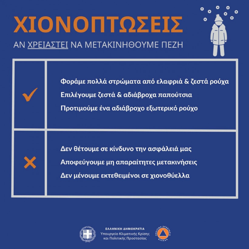 Παράλληλα, η γενική γραμματεία Πολιτικής Προστασίας συνιστά στους πολίτες να είναι ιδιαίτερα προσεκτικοί, μεριμνώντας για τη λήψη μέτρων αυτοπροστασίας από κινδύνους που προέρχονται από την εκδήλωση των έντονων καιρικών φαινομένων.