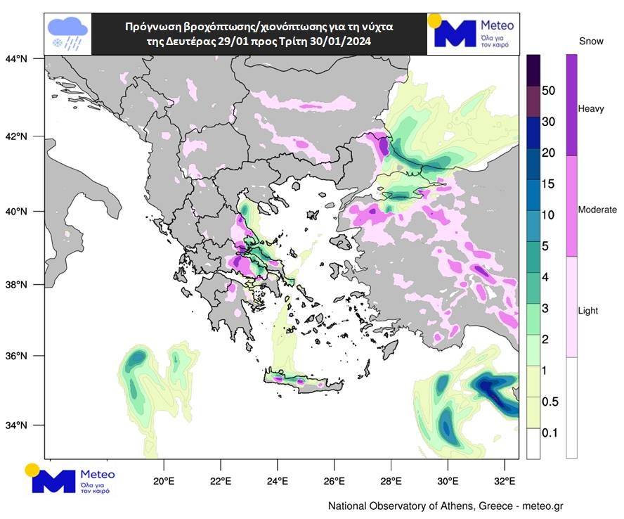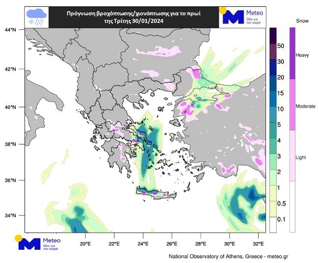 Από τη νύχτα προς Τρίτη 30/01 οι βροχοπτώσεις, καταιγίδες και χιονοπτώσεις θα ενισχυθούν, θα επεκταθούν και στο υπόλοιπο Αιγαίο ενώ πρόσκαιρα έως το πρωί είναι πιθανό να σημειωθούν τοπικές βροχοπτώσεις και χιονοπτώσεις σε Χαλκιδική και Θράκη. Οι χιονοπτώσεις έως το πρωί της Τρίτης 30/01 θα επηρεάσουν και περιοχές χαμηλότερου υψομέτρου της Θεσσαλίας και της Στερεάς. Την Τετάρτη 31/01 τα φαινόμενα θα εντοπίζονται κατά κύριο λόγο στην Κεντρική και Ανατολική Στερεά, στην Πελοπόννησο, στην Εύβοια, στην Κρήτη και στα Δωδεκάνησα.