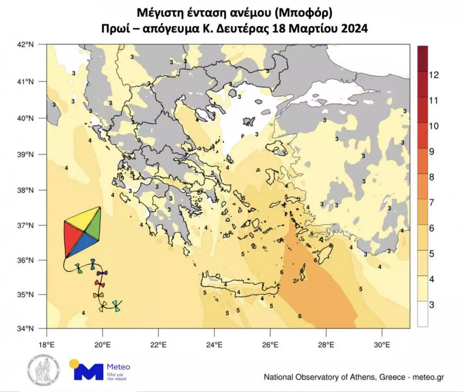 Σύμφωνα με το χάρτη, το πέταγμα του χαρταετού θα είναι εύκολη υπόθεση στα νησιά του Αιγαίου, τα Επτάνησα, τα παράκτια τμήματα του Κορινθιακού Κόλπου, καθώς επίσης και στον Θερμαϊκό Κόλπο έως τις Βόρειες Σποράδες.