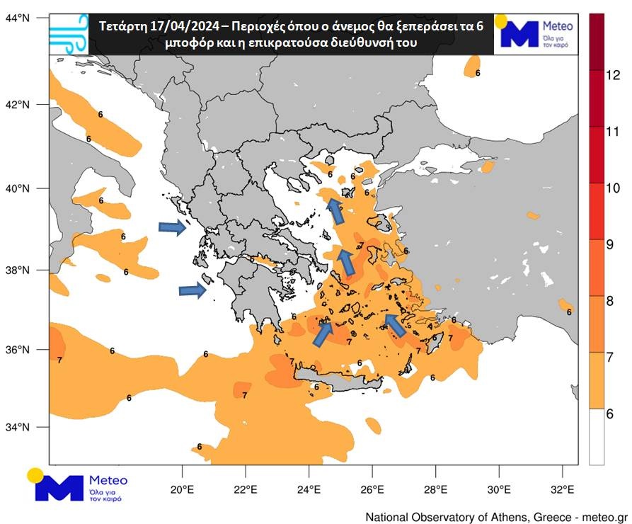 Οι νότιοι άνεμοι στο Αιγαίο θα ενισχυθούν σταδιακά και την Τετάρτη θα φτάνουν κατά τόπους τα 7-8 μποφόρ. Κατά τη διάρκεια της νύχτας προς Πέμπτη 18/04 θα στραφούν σε δυτικούς έως 6-7 μποφόρ. Στο Ιόνιο οι άνεμοι δεν αναμένεται να ξεπερνούν τα 4 μποφόρ έως το μεσημέρι της Τετάρτης 17/04 οπότε θα γίνουν δυτικοί έως 5 και τοπικά έως 6 μποφόρ. Στον Χάρτη της Εικόνας 2 παρουσιάζονται οι περιοχές όπου ο άνεμος θα ξεπεράσει τα 6 μποφόρ την Τετάρτη 17/04 καθώς και η επικρατούσα διεύθυνσή του.