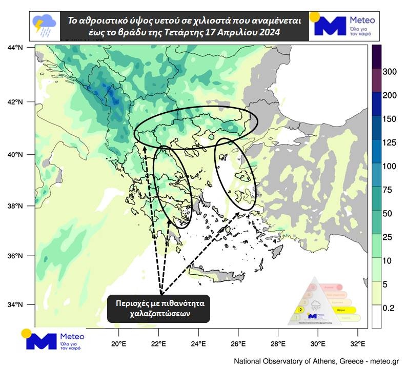 Πιο αναλυτικά, βροχές και ενδεχομένως σποραδικές καταιγίδες αναμένονται από το απόγευμα της Τρίτης 16/04 στο βορειοδυτικά ηπειρωτικά και στο Βόρειο Ιόνιο οι οποίες σταδιακά έως το μεσημέρι της Τετάρτης 17/04 θα ενισχυθούν και θα επεκταθούν στα υπόλοιπα ηπειρωτικά, στο υπόλοιπο Ιόνιο, στην Κρήτη και στο Βόρειο και Ανατολικό Αιγαίο. Πιθανότητα χαλαζοπτώσεων (κυρίως μικρού μεγέθους) υπάρχει κυρίως στα βόρεια, ανατολικά και νοτιοανατολικά ηπειρωτικά καθώς και στο Ανατολικό και Βόρειο Αιγαίο. Κατά της νύχτας προς Πέμπτη 18/04 τα φαινόμενα θα περιοριστούν στη Θράκη, στα ανατολικά τμήματα του Αιγαίου και στα ορεινά των δυτικών και νοτίων ηπειρωτικών, παρουσιάζοντας παράλληλα σημαντική εξασθένηση. Σύμφωνα με την κατηγοριοποίηση των επεισοδίων βροχόπτωσης (Regional Precipitation Index), η οποία εφαρμόζεται από τη μονάδα Meteo του Εθνικού Αστεροσκοπείου Αθηνών, το επεισόδιο βροχόπτωσης για την Τετάρτη 17/04 κατατάσσεται στην Κατηγορία 2 (Μέτρια). Στον χάρτη της Εικόνας 1 παρουσιάζεται το αθροιστικό ύψος υετού σε χιλιοστά που αναμένεται έως το βράδυ της Τετάρτης 17/04.