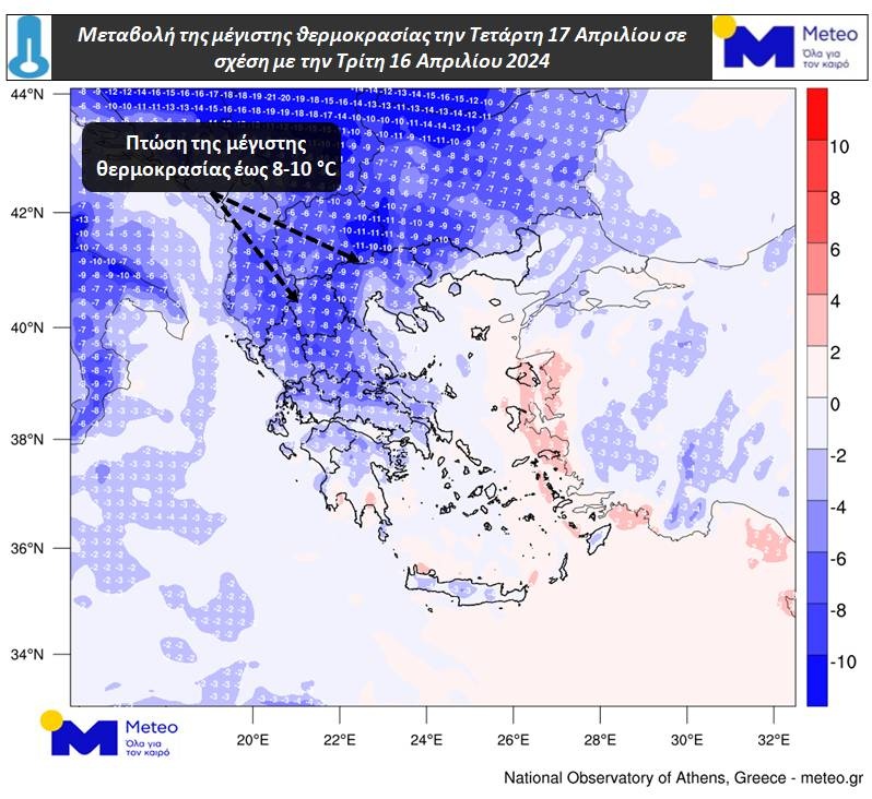 Η θερμοκρασία θα παρουσιάσει πτώση της τάξης των 2 έως 4 °C την Τρίτη 16/04 ενώ την Τετάρτη 17/04 η πτώση της στα βόρεια ηπειρωτικά θα φτάσει κατά τόπους τους 8 έως 10 °C και στα υπόλοιπα ηπειρωτικά τους 4 έως 8 °C υποχωρώντας στα κανονικά για την εποχή επίπεδα. Στον χάρτη της Εικόνας 3 παρουσιάζεται η αναμενόμενη πτώση της μέγιστης θερμοκρασίας την Τετάρτη 17/04.