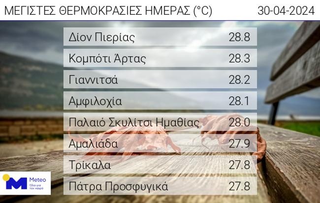Η υψηλότερη θερμοκρασία σημειώθηκε στο μετεωρολογικό σταθμό στο Δίον Πιερίας και ήταν ίση με 28,8 βαθμούς Κελσίου. Στον παρακάτω πίνακα παρουσιάζονται οι 8 σταθμοί του δικτύου αυτόματων μετεωρολογικών σταθμών του meteo.gr / Εθνικού Αστεροσκοπείου Αθηνών που κατέγραψαν τις υψηλότερες θερμοκρασίες.