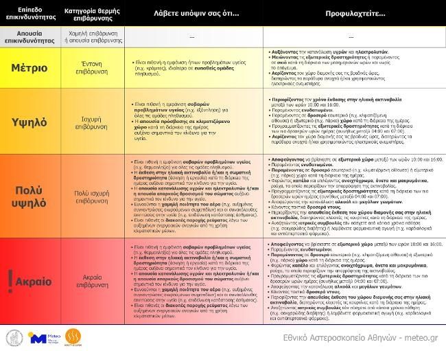Σημειώνεται ότι καθ' όλη τη διάρκεια του τριημέρου 10-12 Ιουλίου 2024, η επικράτηση ισχυρών ανέμων βόρειας διεύθυνσης πάνω από το Αιγαίο και τα ανατολικά ηπειρωτικά τμήματα της χώρας αναμένεται να συμβάλει στη διατήρηση της επικινδυνότητας λόγω θερμής επιβάρυνσης σε χαμηλά σχετικά επίπεδα (μέτριο έως υψηλό), σε αυτές τις περιοχές, στις οποίες συμπεριλαμβάνεται η Ανατολική Αττική, οι Κυκλάδες και η Κρήτη.