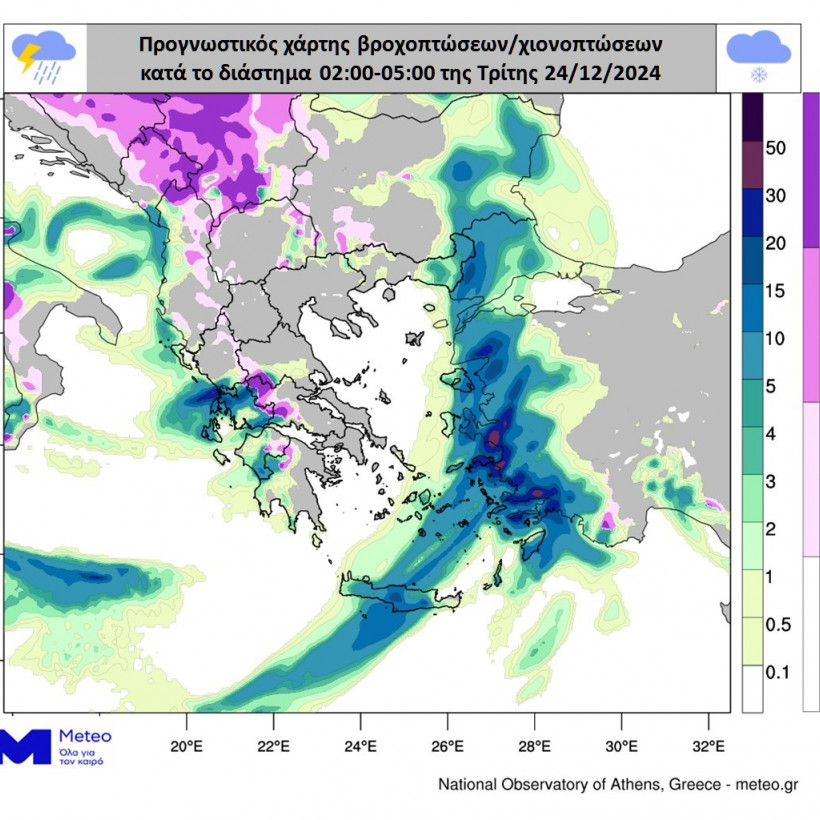 Σύμφωνα με τα προγνωστικά στοιχεία του meteo.gr/Εθνικού Αστεροσκοπείου Αθηνών, οι βροχές που εκδηλώνονται από τις πρωινές ώρες της Δευτέρας (23/12) αναμένεται προοδευτικά να ενταθούν και συνοδευόμενες από καταιγίδες να επεκταθούν μέχρι το απόγευμα σχεδόν στο σύνολο της χώρας με τα φαινόμενα να είναι τοπικά ισχυρά.