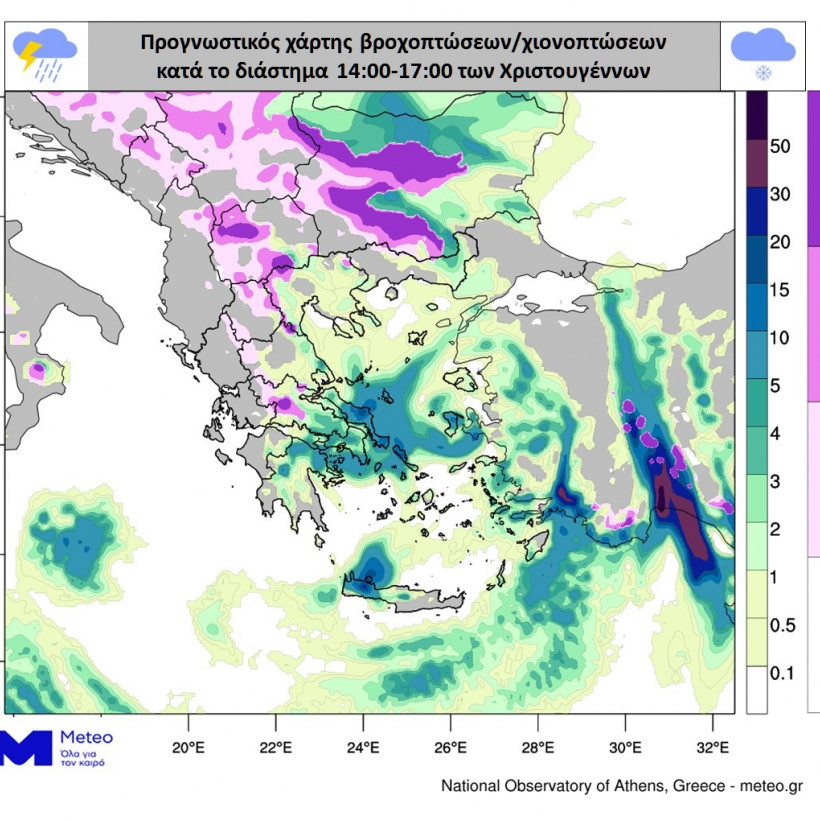 Αναλυτικά, τα Χριστούγεννα αναμένονται νεφώσεις, με βροχές στο μεγαλύτερο μέρος της χώρας με εντονότερα φαινόμενα στα ανατολικά και βορειοανατολικά ηπειρωτικά, στις Σποράδες, στην Εύβοια, στην Κρήτη, στα Δωδεκάνησα και τοπικά στα νησιά του Ανατολικού Αιγαίου. Καταιγίδες θα εκδηλωθούν στο Αιγαίο, στην Κρήτη, στην Εύβοια, στην Ανατολική Θεσσαλία και ενδεχομένως τοπικά στην Ανατολική Στερεά. Χιονοπτώσεις αναμένονται στα περισσότερα ορεινά ηπειρωτικά τμήματα, στα ορεινά της Κρήτης και της Εύβοιας, καθώς και σε ημιορεινά τμήματα της Βόρειας και Κεντρικής Ελλάδας.