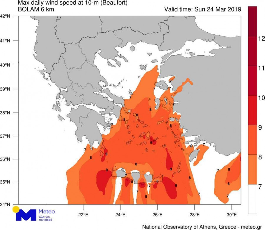 Δείτε στο χάρτη τις περιοχές όπου ο άνεμος θα ξεπεράσει τα 7 μποφόρ την Κυριακή 24/03