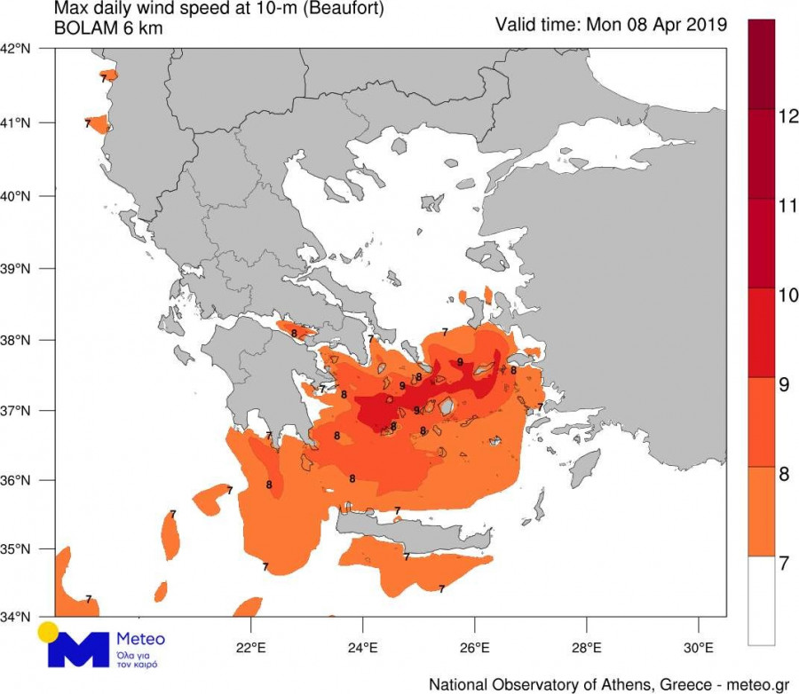 Οι άνεμοι στο Κεντρικό και Νότιο Αιγαίο θα παρουσιάσουν νέα ενίσχυση και θα πνέουν από δυτικές και νοτιοδυτικές διευθύνσεις έως 8 και τοπικά 9 μποφόρ. Στο χάρτη που ακολουθεί φαίνονται οι περιοχές όπου οι άνεμοι αναμένεται να ξεπεράσουν τα 7 μποφόρ.