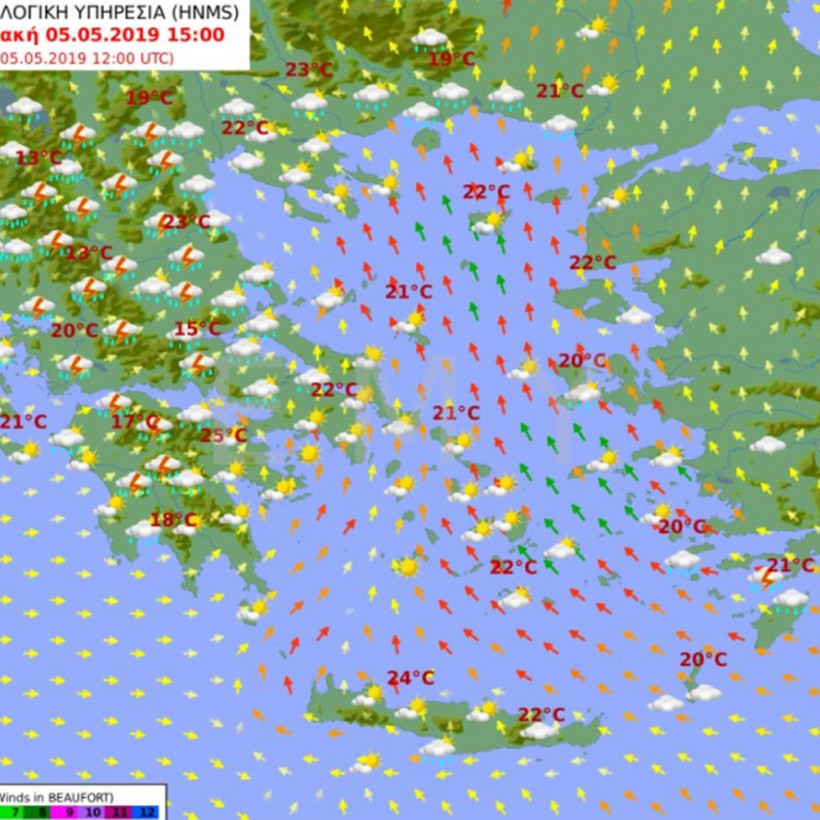 Οι άνεμοι θα πνέουν δυτικοί νοτιοδυτικοί 4 με 6 βαθμιαία 5 με 7 και στα νότια πελάγη τοπικά 8 μποφόρ οι οποίοι από το απόγευμα στα δυτικά θα στραφούν σε δυτικούς βορειοδυτικούς με την ίδια ένταση.