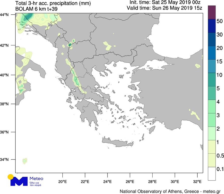 Την Κυριακή 26/05 θα επικρατήσουν νεφώσεις, όπου τις μεσημεριανές και απογευματινές ώρες στα ηπειρωτικά θα αυξηθούν και υπάρχει πιθανότητα τοπικών όμβρων στα ορεινά της Ηπείρου (Χάρτης 2, αριστερά).
