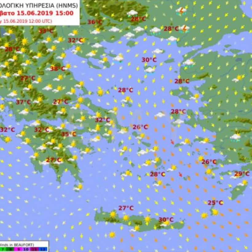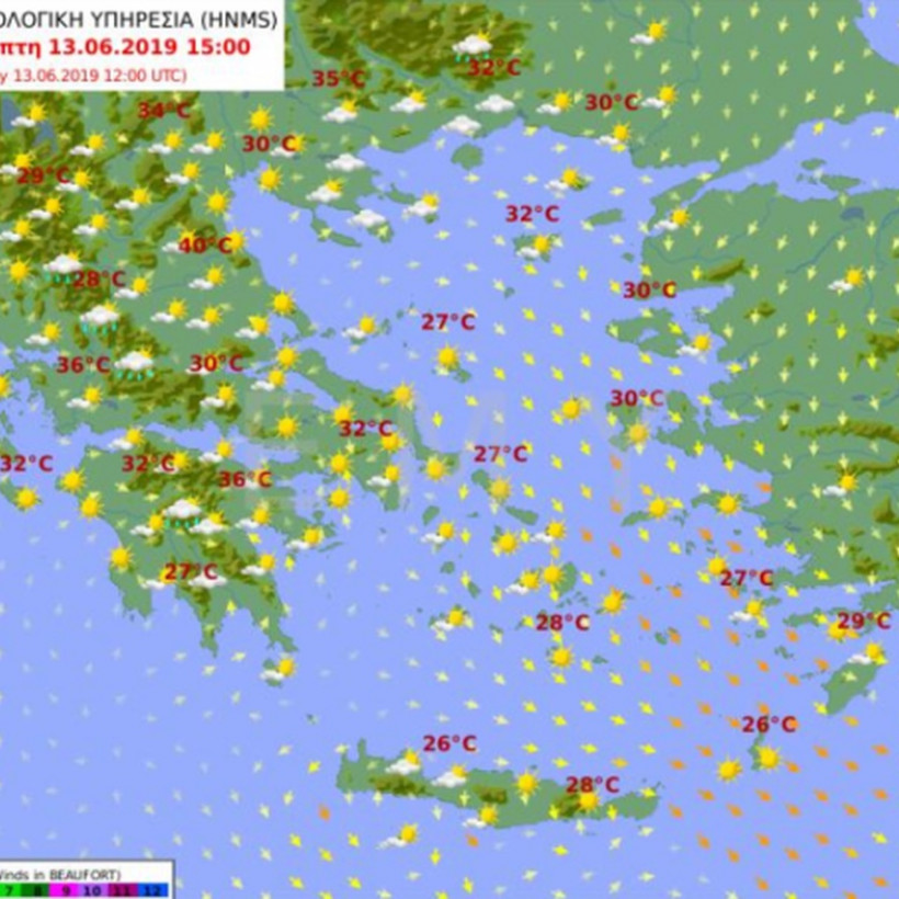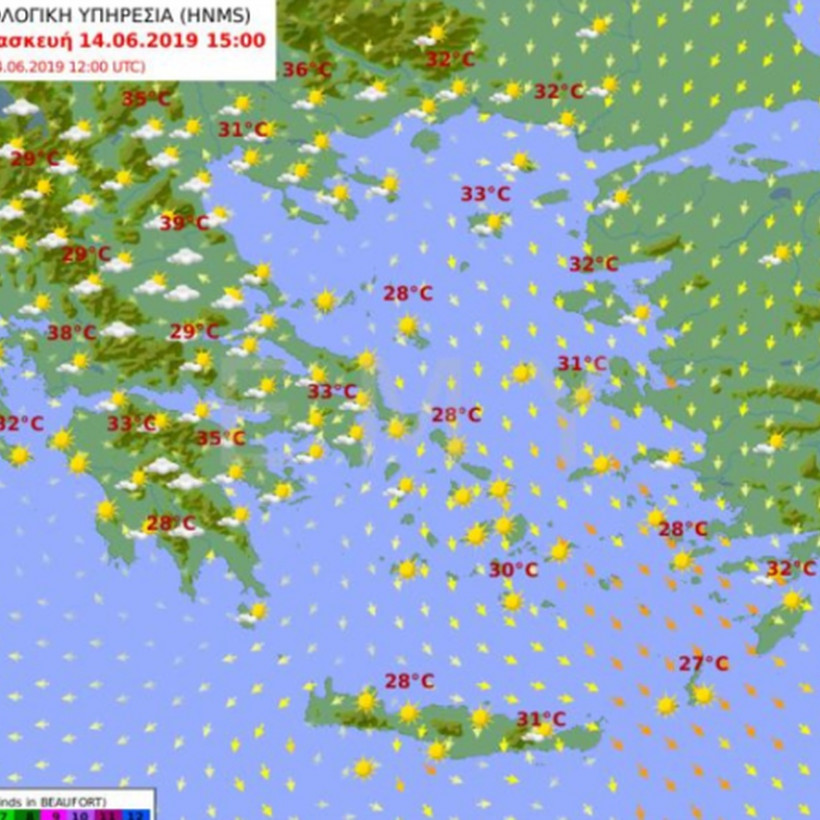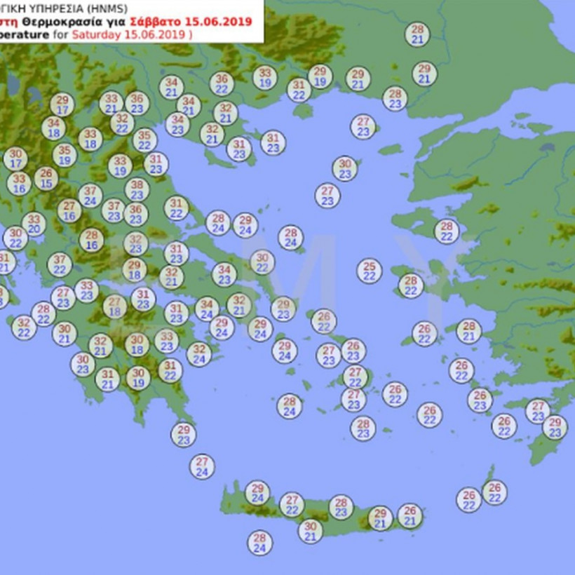 Θερμοκρασία: Από 18 έως 36 και κατά τόπους έως 37 βαθμούς Κελσίου. Στην Ήπειρο η ελάχιστη 2 με 3 βαθμούς χαμηλότερη.