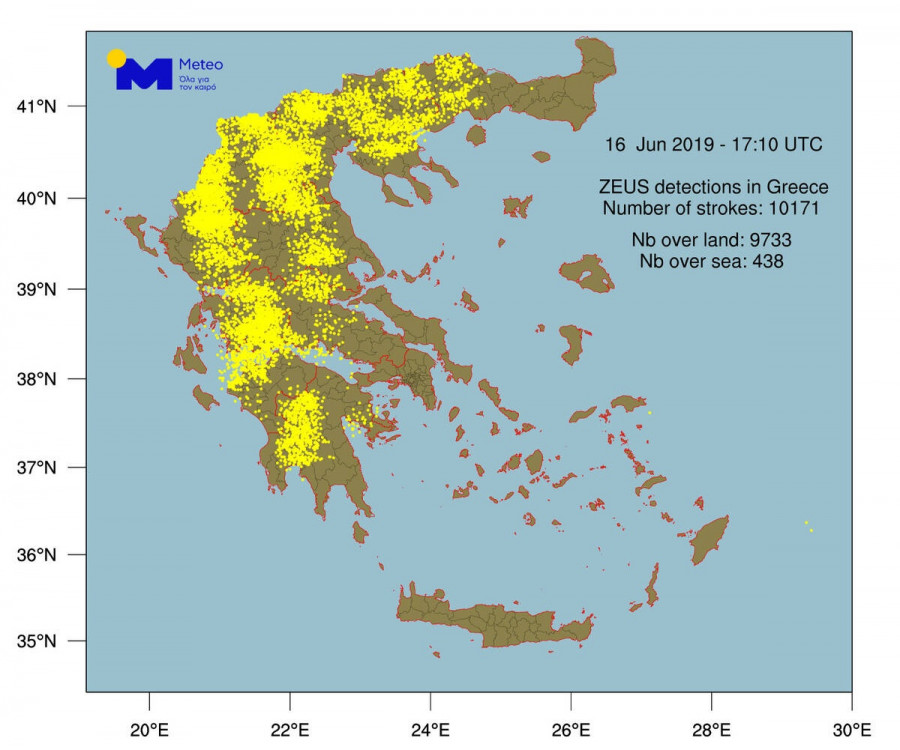 Όπως αναφέρει το meteo.gr, ο συνδυασμός των θερμών και υγρών επιφανειακών αέριων μαζών με την ισχυρή αστάθεια πάνω από τη χώρα μας (δηλαδή την απότομη πτώση της θερμοκρασίας με το ύψος) οδήγησαν σε μεγάλο αριθμό καταιγίδων την Κυριακή. Αρχικά, λίγο μετά το μεσημέρι της Κυριακής οι πρώτες αναπτύξεις καταιγίδων παρατηρήθηκαν στην Πίνδο και στα ορεινά της Αν. Μακεδονίας αλλά γρήγορα επεκτάθηκαν στο μεγαλύτερο μέρος της ηπειρωτικής χώρας. Σε πολλές περιπτώσεις οι καταιγίδες συνοδεύονταν από μεγάλο χαλάζι, όπως για παράδειγμα στο Τρίστενο και Τσεπέλοβο Ιωαννίνων, σε περιοχές της Πέλλας και της Κοζάνης. Παράλληλα, εντυπωσιακός ο αριθμός κεραυνών που κατέγραψε το σύστημα ανίχνευσης του Εθνικού Αστεροσκοπείου Αθηνών/meteo.gr "ZEUS" και παρουσιάζουμε στον παρακάτω χάρτη, με πάνω από 10.000 κεραυνούς σε διάστημα 12 ωρών.