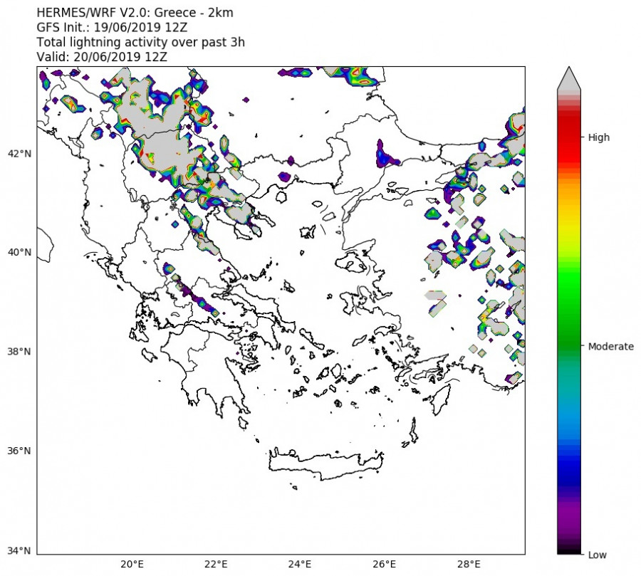 Στον χάρτη που ακολουθεί παρουσιάζεται η πιθανότητα ηλεκτρικής δραστηριότητας τις μεσημεριανές ώρες της Πέμπτης: