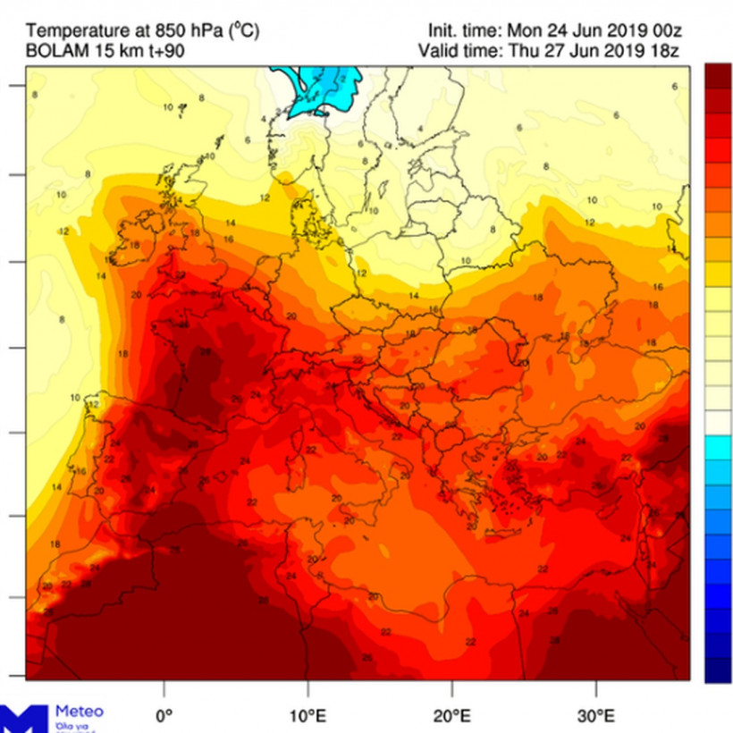 Η Ελλάδα – σύμφωνα με την μετεωρολογική υπηρεσία meteo του Εθνικού Αστεροσκοπείου Αθηνών - δεν θα επηρεαστεί άμεσα από τον καύσωνα της Δυτικής Ευρώπης, τουλάχιστον έως το Σαββατοκύριακο 29-30 Ιουνίου, καθώς θα βρίσκεται κάτω από την επιρροή ενός βαρομετρικού χαμηλού, που θα οδηγήσει σε άστατο καιρό και φυσιολογικές για την εποχή θερμοκρασίες με μέγιστες τιμές γύρω στους 32 έως 35 βαθμούς Κελσίου.