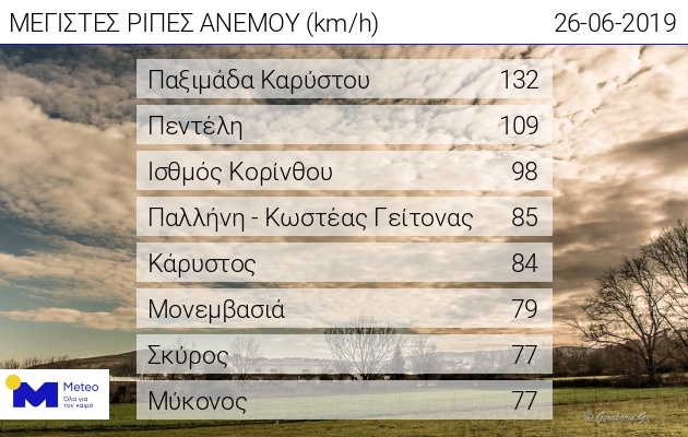 Σύμφωνα με το δίκτυο των αυτόματων μετεωρολογικών σταθμών του Εθνικού Αστεροσκοπείου Αθηνών-meteo, οι ισχυρότερες ριπές ανέμου έως τις 17:00 περίπου της Τετάρτης καταγράφηκαν στην Παξιμάδα Καρύστου, όπου το μελτέμι έφτασε στιγμιαία στα 132 χιλιόμετρα την ώρα, στην Πεντέλη (109 χλμ/ώρα) και στον Ισθμό της Κορίνθου (98 χλμ/ώρα). Εξίσου ισχυροί βόρειοι άνεμοι αναμένεται να πνεύσουν και αύριο.