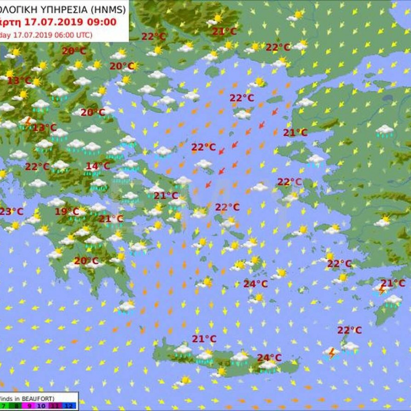 Άνεμοι: Από βόρειες και στα Δωδεκάνησα από ανατολικές διευθύνσεις 3 με 5 μποφόρ.