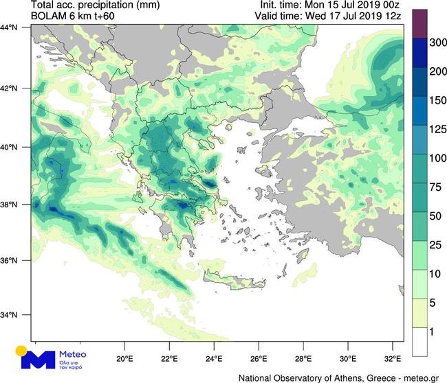 Στην παρακάτω εικόνα παρουσιάζεται η κατανομή του ολικού υετού (βροχή/χαλάζι) που περιμένουμε έως και το μεσημέρι της Τετάρτης (17/7).