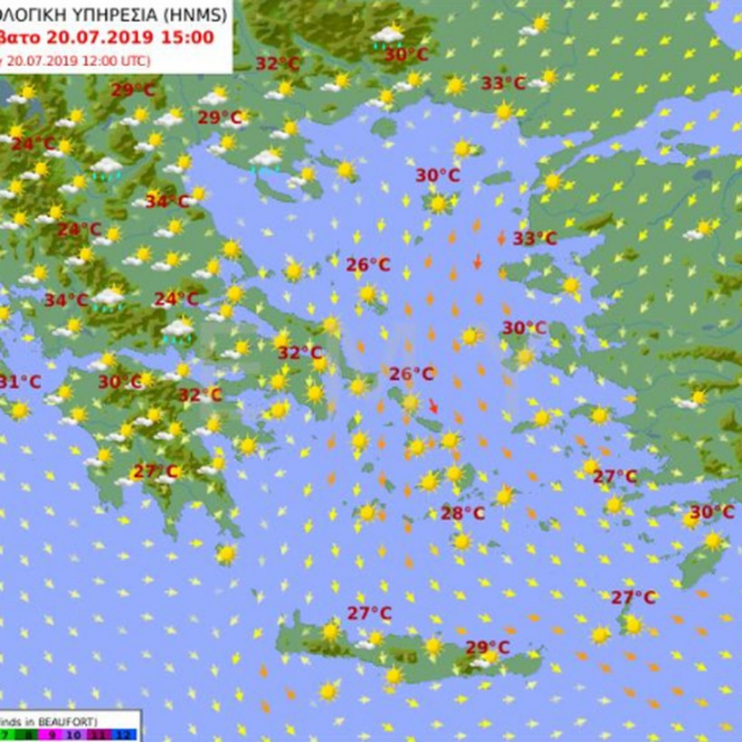 Θερμοκρασία: Από 21 έως 30 βαθμούς Κελσίου και στη νότια Κρήτη 2 με 3 βαθμούς υψηλότερη.