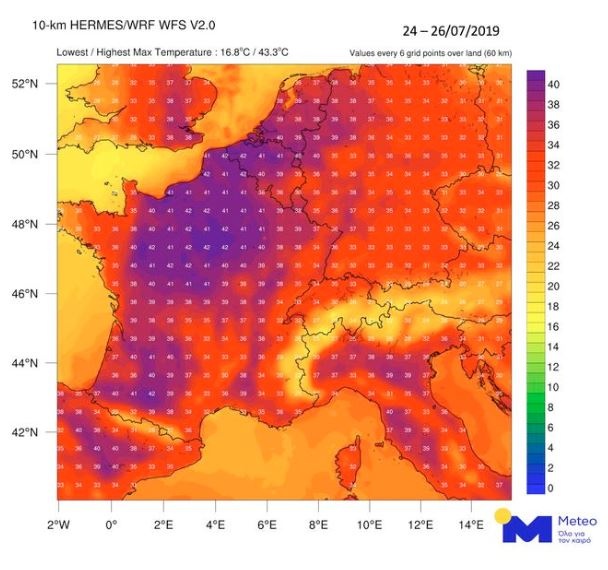 Οι θερμοκρασίες αναμένεται να ξεπεράσουν τους 40 βαθμούς σε μεγάλο μέρος της βορειοανατολικής Γαλλίας, με κάποιες περιοχές να καταγράφουν ακόμη και 43 βαθμούς.