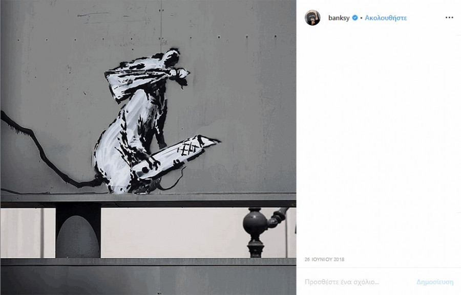 Το έργο, που απεικονίζει ένα ποντίκι με καλυμμένη τη μουσούδα του να κραδαίνει ένα μολύβι, «εμφανίστηκε στις 25 Ιουνίου 2018 και την επομένη, αναφερόταν στον λογαριασμό στο Instagram του καλλιτέχνη» ότι ανήκει στον Banksy.
