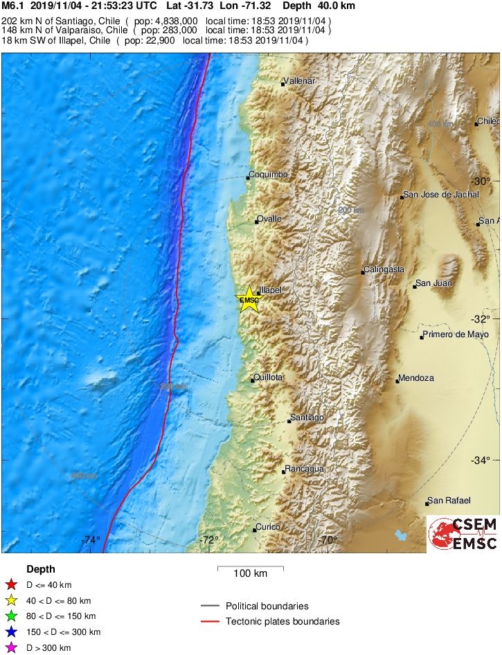 Η αυτόματη λύση του Ευρωπαϊκού - Μεσογειακού Σεισμολογικού Ινστιτούτου (EMSC) δίνει το σεισμό στα 6,1 Ρίχτερ, με εστιακό βάθος τα 40 χλμ. και επίκεντρο τα 202 χλμ. βόρεια του Σαντιάγο.