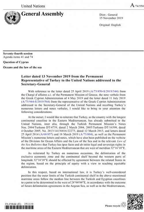 Η Τουρκία με εκτενή επιστολή της στον ΟΗΕ, με ημερομηνία 13 Νοεμβρίου 2019, προβάλλει τις πάγιες θέσεις της για το ζήτημα της οριοθέτησης ΑΟΖ και υφαλοκρηπίδας, ισχυριζόμενη ότι διαθέτει θαλάσσια σύνορα στην Ανατολική Μεσόγειο με την Αίγυπτο, παραβλέποντας τα δικαιώματα της Κυπριακής Δημοκρατίας, την οποία δεν αναγνωρίζει.