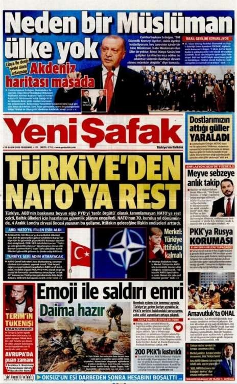 Το πρωτοσέλιδό της φιλοκυβερνητικής εφημερίδας σήμερα, Πέμπτη (28/11), , με τίτλο «Στο τραπέζι ο χάρτης της Μεσογείου» γράφει χαρακτηριστικά: «Με τη συμφωνία η προσπάθεια της Ελλάδας να εισβάλλει στη Μεσόγειο θα πέσει στο κενό ενώ Τουρκία και Λιβύη θα αποκτήσουν θαλάσσιες αρμοδιότητες στην περιοχή νότια της Κρήτης και γύρω από την Κύπρο».