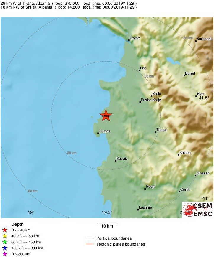 Το ακριβές επίκεντρο τη δόνησης εντοπίζεται στα 8 χλμ. βόρεια του Δυρραχίου και 29 χλμ. δυτικά των Τιράνων.