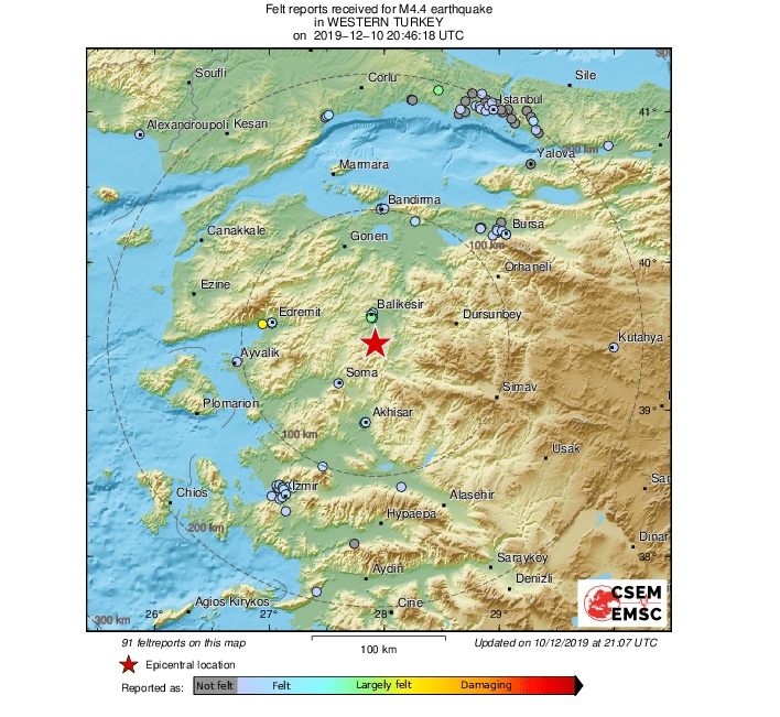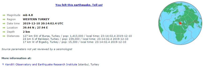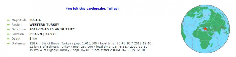 Ισχυρή σεισμική δόνηση σημειώθηκε το βράδυ (22:14) της Τρίτης, 10/12/2019, στην Τουρκία. Σύμφωνα με τις πρώτες εκτιμήσεις του Ευρωμεσογειακού Σεισμολογικού Ινστιτούτου το μέγεθος του σεισμού είναι στα 4,8 Ρίχτερ με εστιακό βάθος 2 χιλιομέτρων.